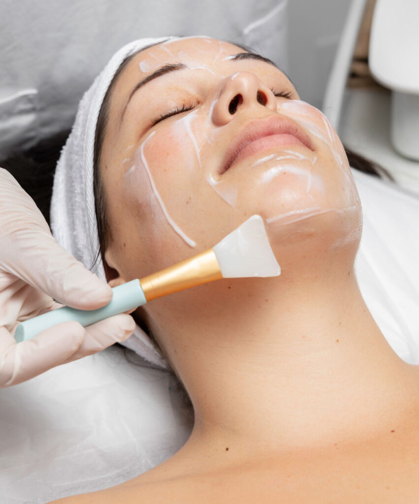 Limpeza e preparação: O rosto é higienizado e, em alguns casos, recebe substâncias pré-peeling para uniformizar a ação do ácido.